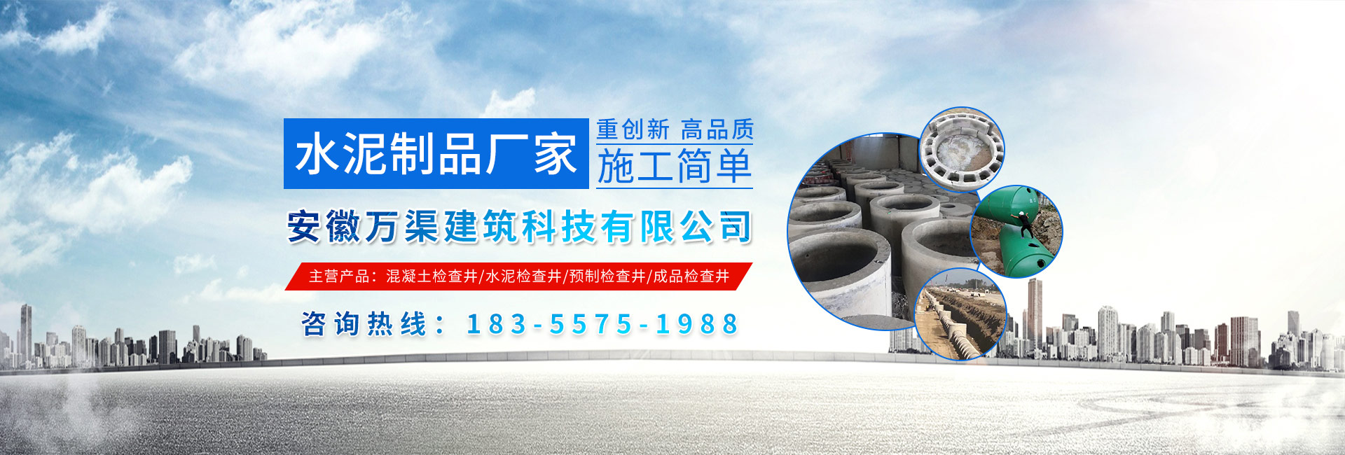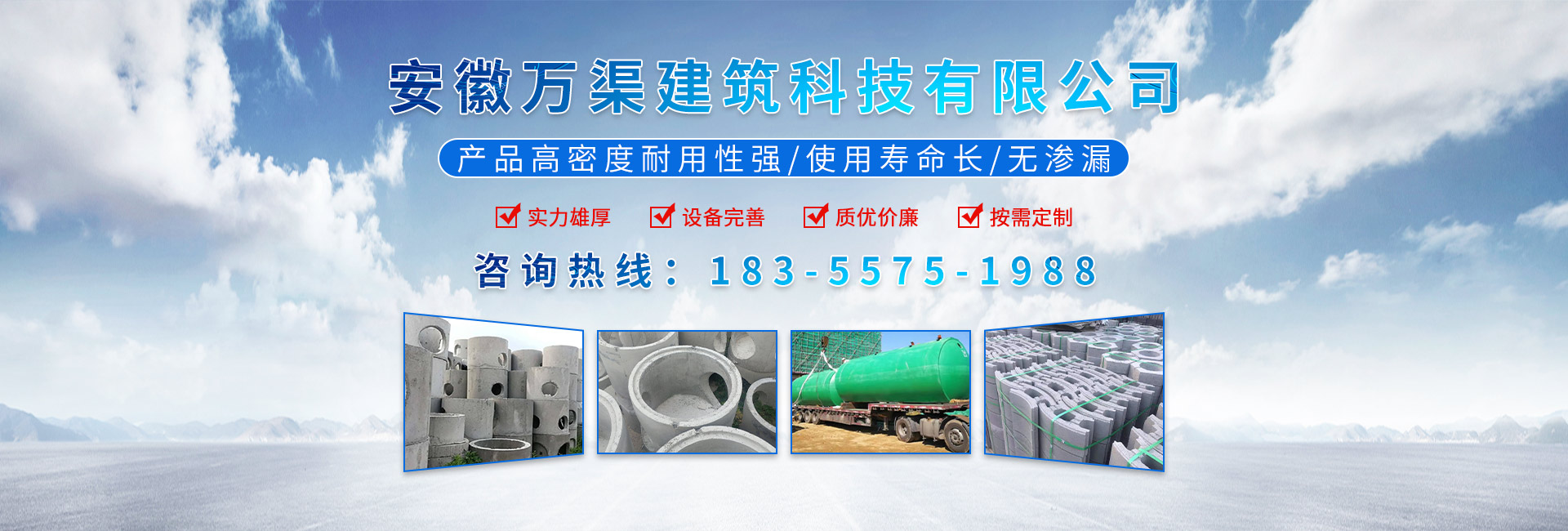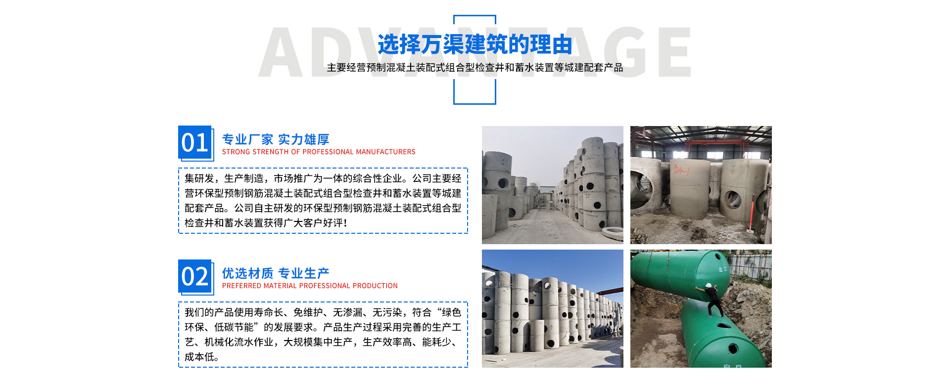 安徽萬渠建筑科技有限公司是集研發(fā),生產(chǎn)制造,市場推廣為一體的綜合性企業(yè)。公司主要經(jīng)營環(huán)保型預(yù)制鋼筋混凝土裝配式組合型檢查井和蓄水裝置等城建配套產(chǎn)品。產(chǎn)品生產(chǎn)過程采用獨(dú)特的生產(chǎn)工藝,機(jī)械化流水作業(yè)。產(chǎn)品大規(guī)模生產(chǎn),生產(chǎn)效率高,耗能少,成本低,產(chǎn)品使用壽命長、免維護(hù)、無滲漏、無污染,符合“綠色環(huán)保,低碳節(jié)能”的發(fā)展要求,是傳統(tǒng)磚砌井池的理想替代產(chǎn)品。
